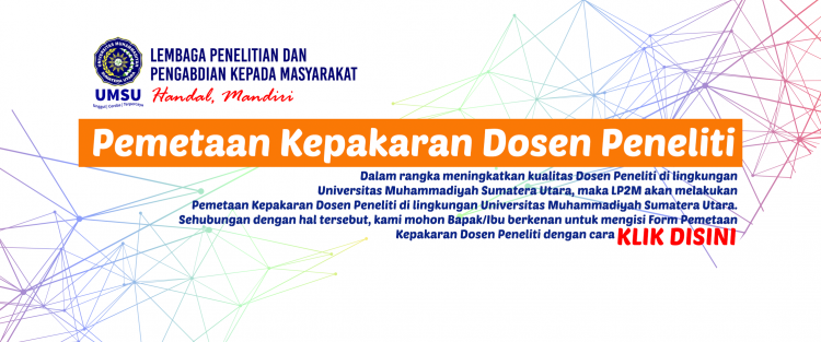 Dalam rangka meningkatkan kualitas Dosen di lingkungan Universitas Muhammadiyah Sumatera Utara, maka LP2M akan melakukan Pemetaan Kepakaran Dosen di lingkungan Universitas Muhammadiyah Sumatera Utara. Sehubungan dengan hal tersebut, kami mohon Bapak/Ibu berkenan untuk mengisi Form Pemetaan Kepakaran Dosen Peneliti pada formulir dibawah ini :